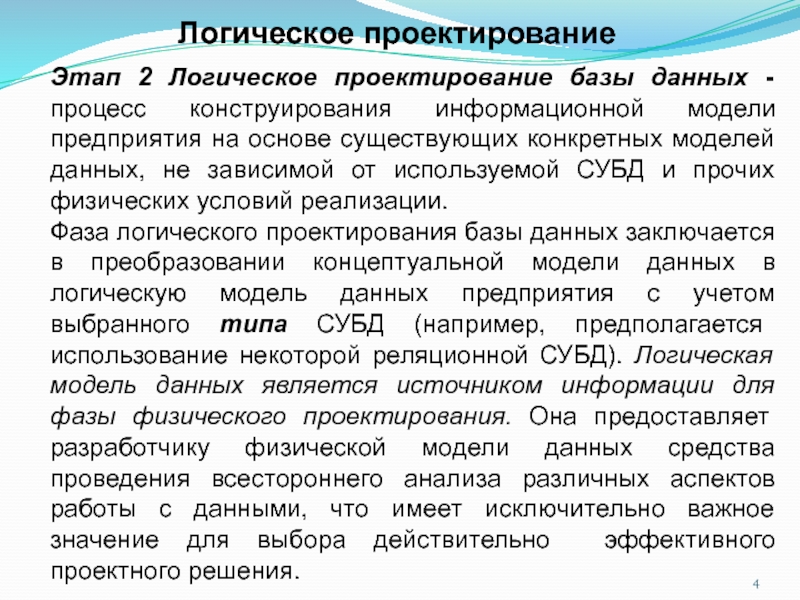 Фаза логического проектирования базы данных заключается в преобразовании концептуальной модели данных в логическую модель данных предприятия с учетом выбранного типа СУБД (например, предполагается использование некоторой реляционной СУБД). Логическая модель данных является источником информации для фазы физического проектирования. Она предоставляет разработчику физической модели данных средства проведения всестороннего анализа различных аспектов работы с данными, что имеет исключительно важное значение для выбора действительно эффективного проектного решения.