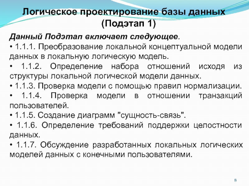 Слайд 8Логическое проектирование базы данных (Подэтап 1)