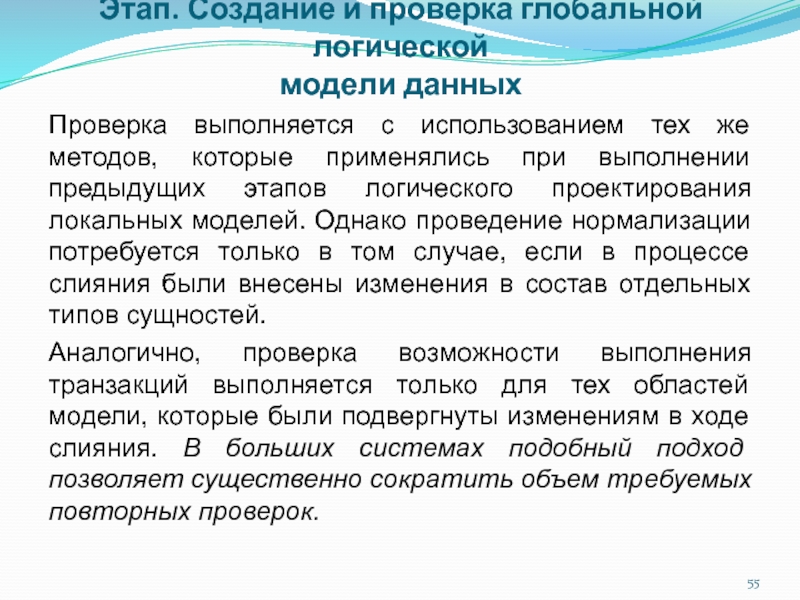 Очень важно, чтобы созданная глобальная модель была легко расширяема. Если модель сможет поддерживать только текущие требования, то время ее существования будет весьма ограниченным, а для реализации поддержки новых или изменяющихся требований потребуется прилагать значительные усилия. Необходимо так построить модель, чтобы она была легко расширяема и позволяла реализовать поддержку новых требований с минимальным изменениями в работе уже существующих пользователей. Следовательно, имеет смысл выполнить проверку созданной модели с точки зрения эффективности реализации новых требований, которые могут иметь место в будущем. Однако не следует вносить в модель каких-либо изменений, пока они не будут одобрены пользователями.