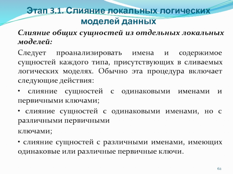 Слайд 62Этап 3.1. Слияние локальных логических моделей данных