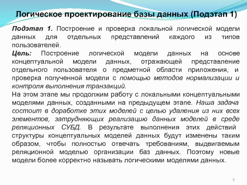 Слайд 7Логическое проектирование базы данных (Подэтап 1)