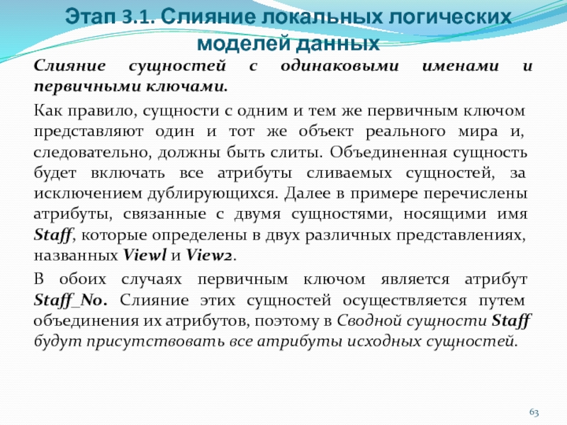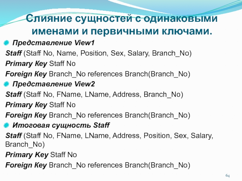 тем же первичным ключом представляют один и тот же объект реального мира и, следовательно, должны быть слиты. Объединенная сущность будет включать все атрибуты сливаемых сущностей, за исключением дублирующихся. Далее в примере перечислены атрибуты, связанные с двумя сущностями, носящими имя Staff, которые определены в двух различных представлениях, названных Viewl и View2.