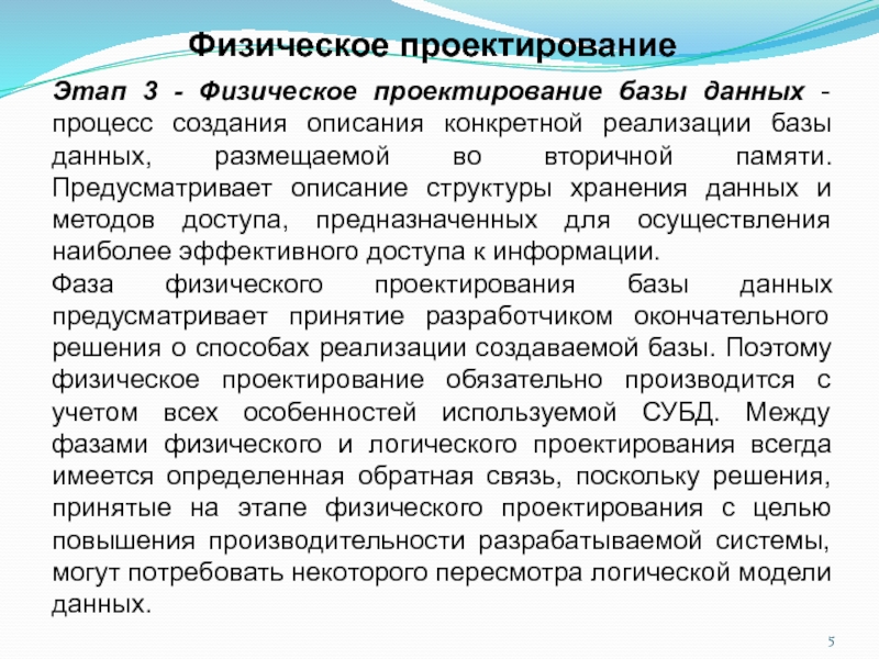 Фаза физического проектирования базы данных предусматривает принятие разработчиком окончательного решения о способах реализации создаваемой базы. Поэтому физическое проектирование обязательно производится с учетом всех особенностей используемой СУБД. Между фазами физического и логического проектирования всегда имеется определенная обратная связь, поскольку решения, принятые на этапе физического проектирования с целью повышения производительности разрабатываемой системы, могут потребовать некоторого пересмотра логической модели данных.