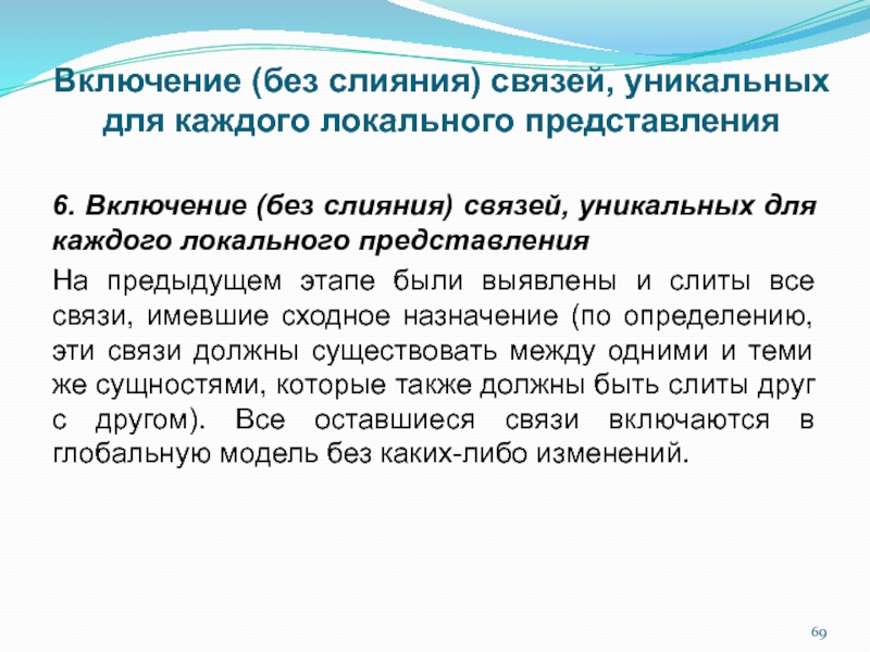 Слайд 69Включение (без слияния) связей, уникальных для каждого локального представления