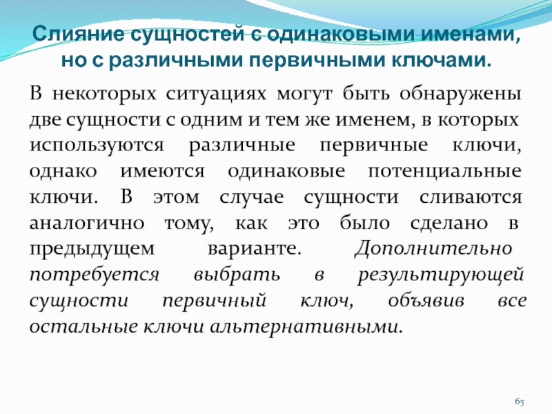 Слайд 65Слияние сущностей с одинаковыми именами, но с различными первичными ключами.