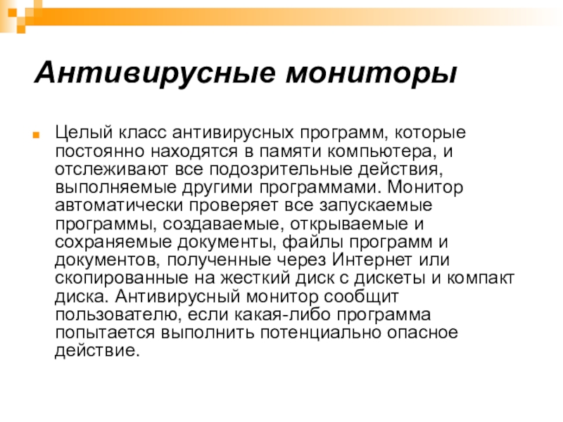 Антивирусные мониторы Целый класс антивирусных программ, которые постоянно находятся в памяти компьютера, и отслеживают все подозрительные действия,