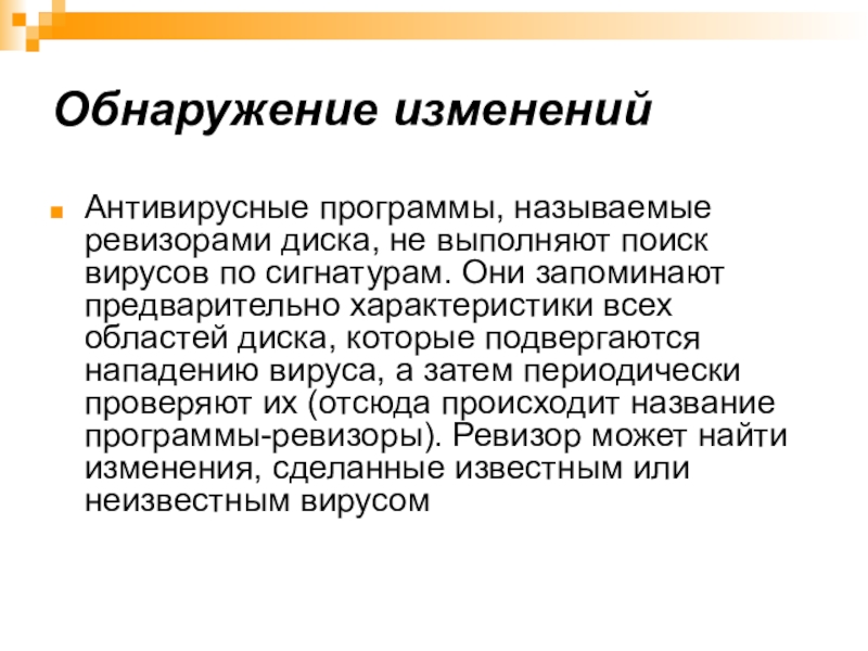 подвергаются нападению вируса, а затем периодически проверяют их (отсюда происходит название программы-ревизоры). Ревизор может найти изменения, сделанные известным или неизвестным вирусом