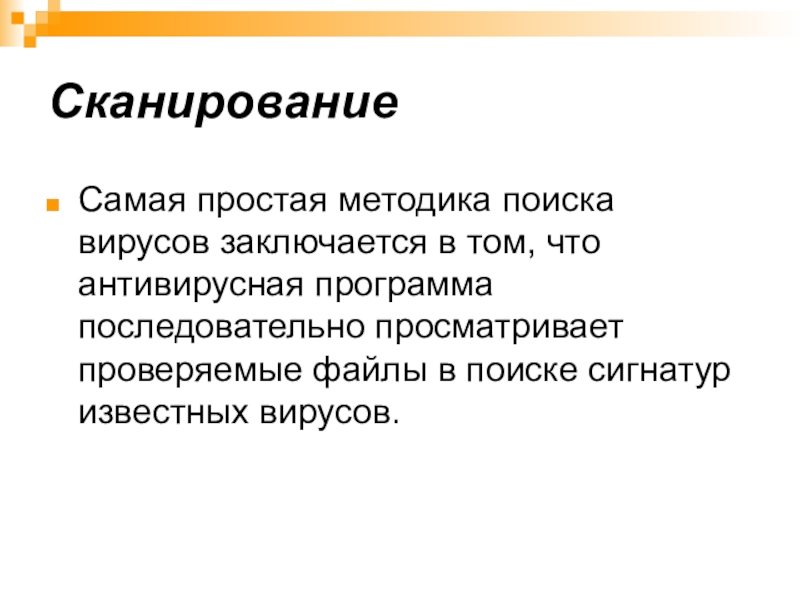 СканированиеСамая простая методика поиска вирусов заключается в том, что антивирусная программа последовательно просматривает проверяемые файлы в поиске