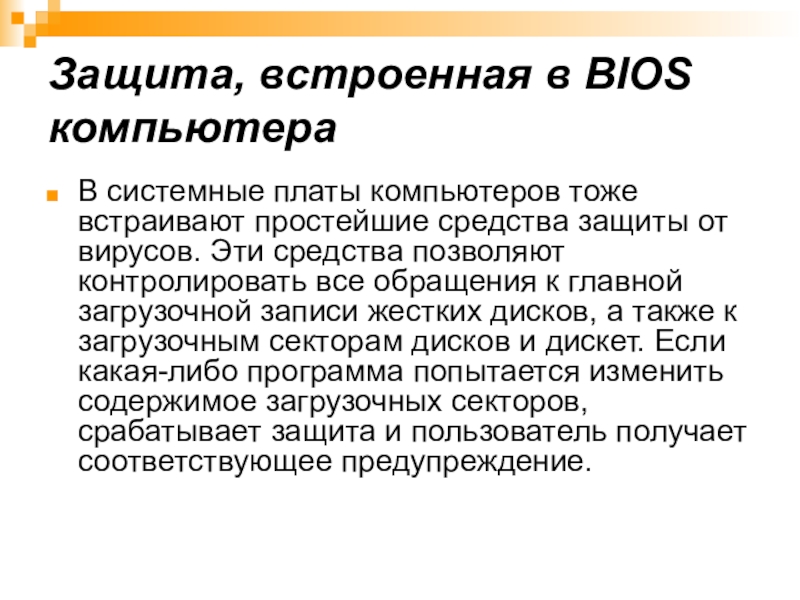 Защита, встроенная в BIOS компьютераВ системные платы компьютеров тоже встраивают простейшие средства защиты от вирусов. Эти средства