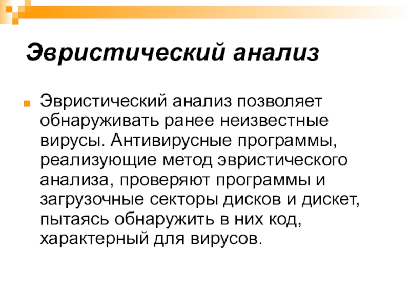 Эвристический анализЭвристический анализ позволяет обнаруживать ранее неизвестные вирусы. Антивирусные программы, реализующие метод эвристического анализа, проверяют программы и