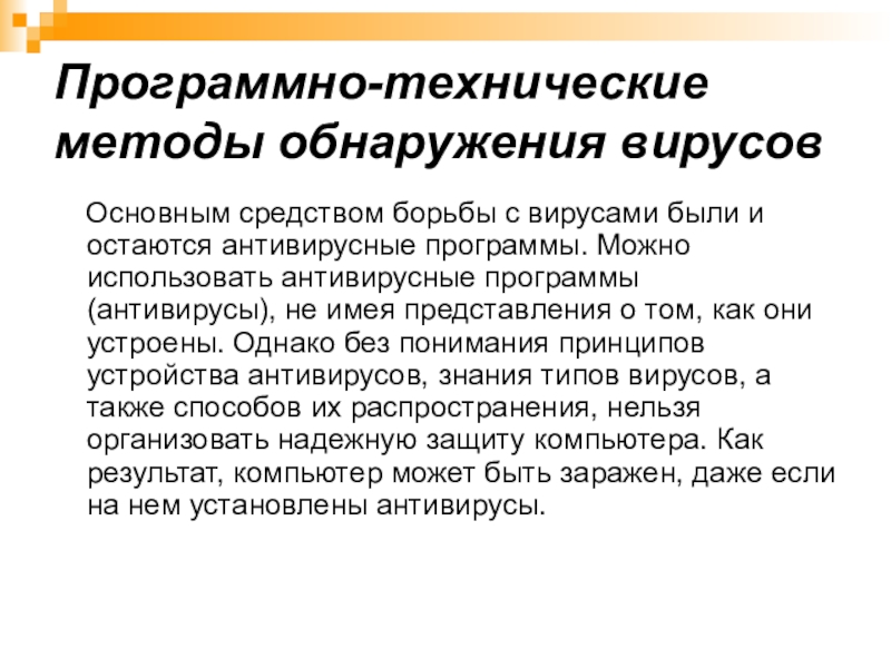 Программно-технические методы обнаружения вирусов  Основным средством борьбы с вирусами были и остаются антивирусные программы. Можно использовать