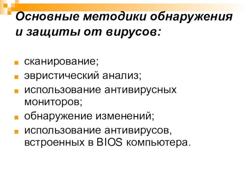 Основные методики обнаружения и защиты от вирусов: сканирование;эвристический анализ;использование антивирусных мониторов;обнаружение изменений;использование антивирусов, встроенных в BIOS компьютера.