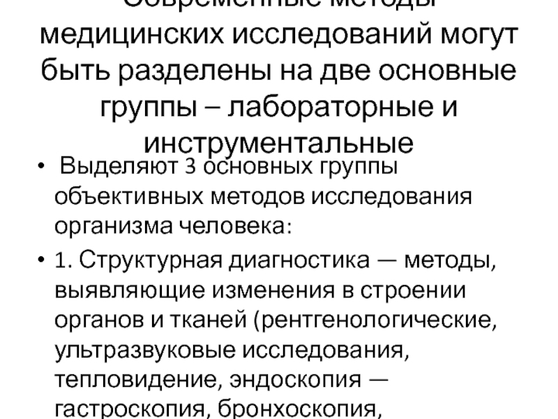 Слайд 2Современные методы медицинских исследований могут быть разделены на две основные