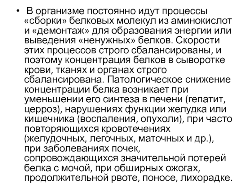 этих процессов строго сбалансированы, и поэтому концентрация белков в сыворотке крови, тканях и органах строго сбалансирована. Патологическое снижение концентрации белка возникает при уменьшении его синтеза в печени (гепатит, церроз), нарушениях функции желудка или кишечника (воспаления, опухоли), при часто повторяющихся кровотечениях (желудочных, легочных, маточных и др.), при заболеваниях почек, сопровождающихся значительной потерей белка с мочой, при обширных ожогах, продолжительной рвоте, поносе, лихорадке.