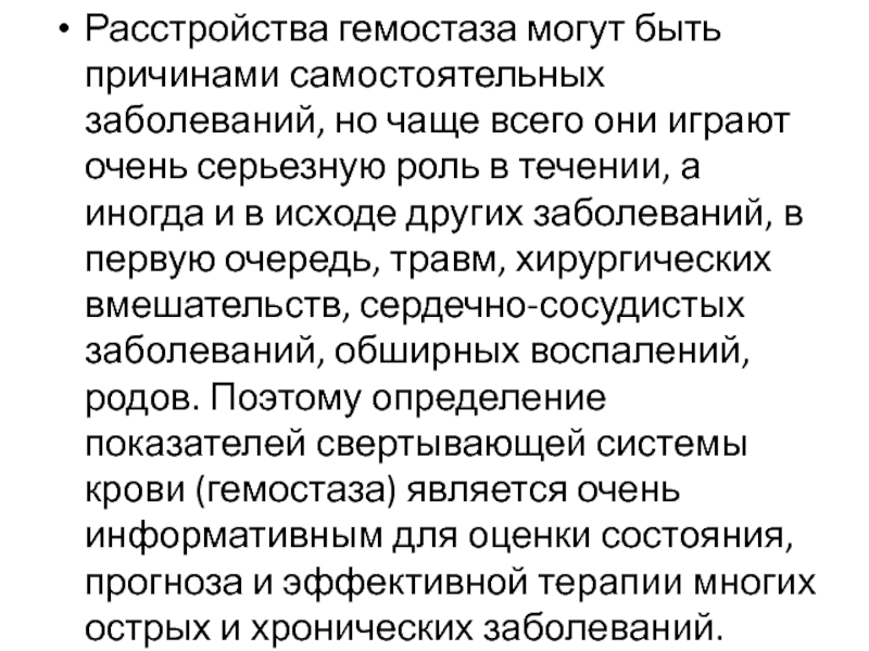 в исходе других заболеваний, в первую очередь, травм, хирургических вмешательств, сердечно-сосудистых заболеваний, обширных воспалений, родов. Поэтому определение показателей свертывающей системы крови (гемостаза) является очень информативным для оценки состояния, прогноза и эффективной терапии многих острых и хронических заболеваний.