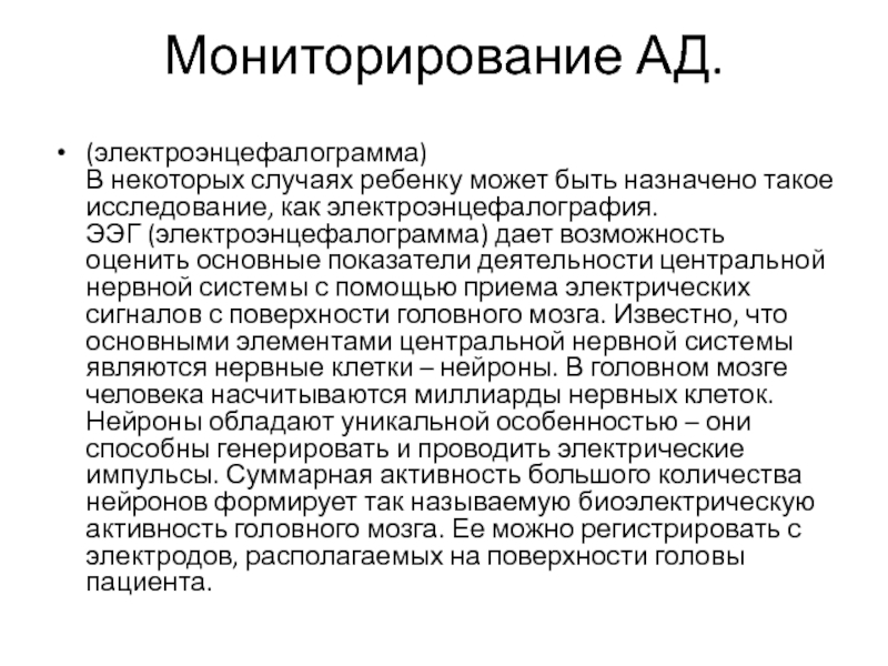 нервной системы с помощью приема электрических сигналов с поверхности головного мозга. Известно, что основными элементами центральной нервной системы являются нервные клетки – нейроны. В головном мозге человека насчитываются миллиарды нервных клеток. Нейроны обладают уникальной особенностью – они способны генерировать и проводить электрические импульсы. Суммарная активность большого количества нейронов формирует так называемую биоэлектрическую активность головного мозга. Ее можно регистрировать с электродов, располагаемых на поверхности головы пациента.