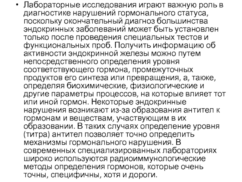 после проведения специальных тестов и функциональных проб. Получить информацию об активности эндокринной железы можно путем непосредственного определения уровня соответствующего гормона, промежуточных продуктов его синтеза или превращения, а, также, определяя биохимические, физиологические и другие параметры процессов, на которые влияет тот или иной гормон. Некоторые эндокринные нарушения возникают из-за образования антител к гормонам и веществам, участвующим в их образовании. В таких случаях определение уровня (титра) антител позволяет точно определить механизмы гормонального нарушения. В современных специализированных лабораториях широко используются радиоиммунологические методы определения гормонов, которые очень точны, специфичны, хотя и дороги.