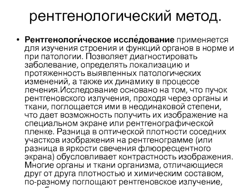 и протяженность выявленных патологических изменений, а также их динамику в процессе лечения.Исследование основано на том, что пучок рентгеновского излучения, проходя через органы и ткани, поглощается ими в неодинаковой степени, что дает возможность получить их изображение на специальном экране или рентгенографической пленке. Разница в оптической плотности соседних участков изображения на рентгенограмме (или разница в яркости свечения флюоресцентного экрана) обусловливает контрастность изображения. Многие органы и ткани организма, отличающиеся друг от друга плотностью и химическим составом, по-разному поглощают рентгеновское излучение, что обусловливает естественную контрастность получаемого изображения