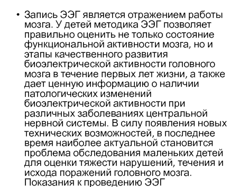 и этапы качественного развития биоэлектрической активности головного мозга в течение первых лет жизни, а также дает ценную информацию о наличии патологических изменений биоэлектрической активности при различных заболеваниях центральной нервной системы. В силу появления новых технических возможностей, в последнее время наиболее актуальной становится проблема обследования маленьких детей для оценки тяжести нарушений, течения и исхода поражений головного мозга.