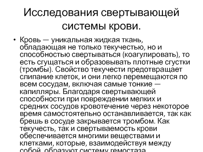 и образовывать плотные сгустки (тромбы). Свойство текучести предотвращает слипание клеток, и они легко перемещаются по всем сосудам, включая самые тонкие — капилляры. Благодаря свертывающей способности при повреждении мелких и средних сосудов кровотечение через некоторое время самостоятельно останавливается, так как брешь в сосуде закрывается тромбом. Как текучесть, так и свертываемость крови обеспечивается многими веществами и клетками, которые, взаимодействуя между собой, образуют систему гемостаза.
