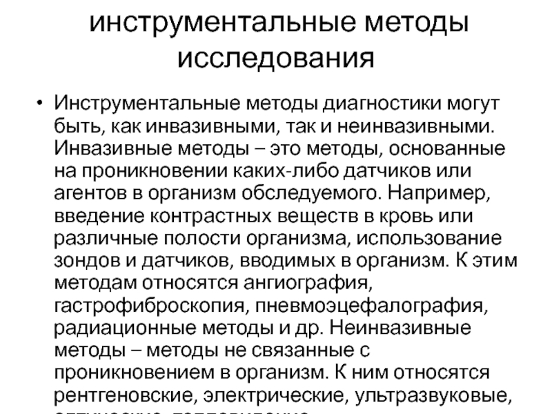 каких-либо датчиков или агентов в организм обследуемого. Например, введение контрастных веществ в кровь или различные полости организма, использование зондов и датчиков, вводимых в организм. К этим методам относятся ангиография, гастрофиброскопия, пневмоэцефалография, радиационные методы и др. Неинвазивные методы – методы не связанные с проникновением в организм. К ним относятся рентгеновские, электрические, ультразвуковые, оптические, тепловидение.