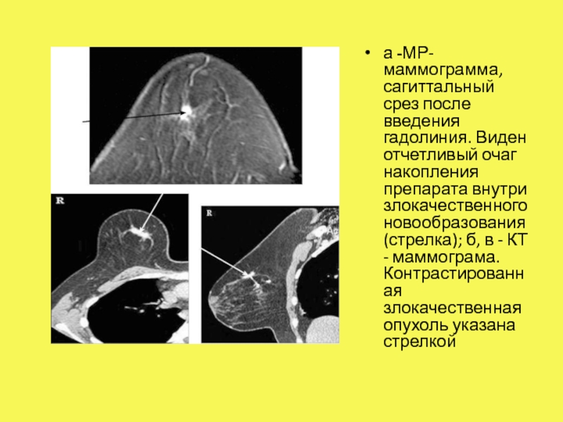 Слайд 35а -МР-маммограмма, сагиттальный срез после введения гадолиния. Виден отчетливый очаг