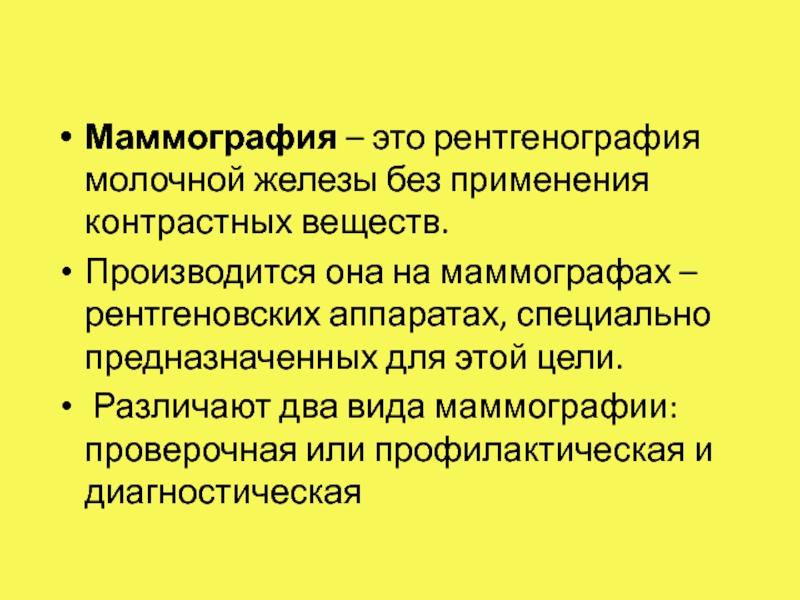 Слайд 4Маммография – это рентгенография молочной железы без применения контрастных веществ.