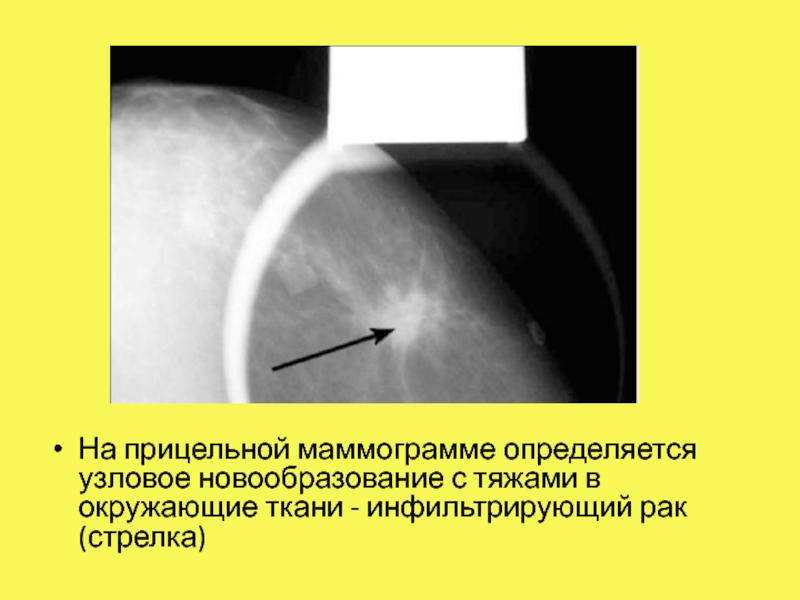 Слайд 30На прицельной маммограмме определяется узловое новообразование с тяжами в окружающие