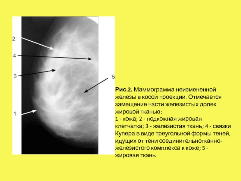 Слайд 5Рис.2. Маммограмма неизмененной железы в косой проекции. Отмечается замещение части железистых