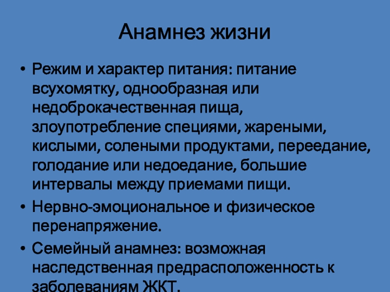 злоупотребление специями, жареными, кислыми, солеными продуктами, переедание, голодание или недоедание,