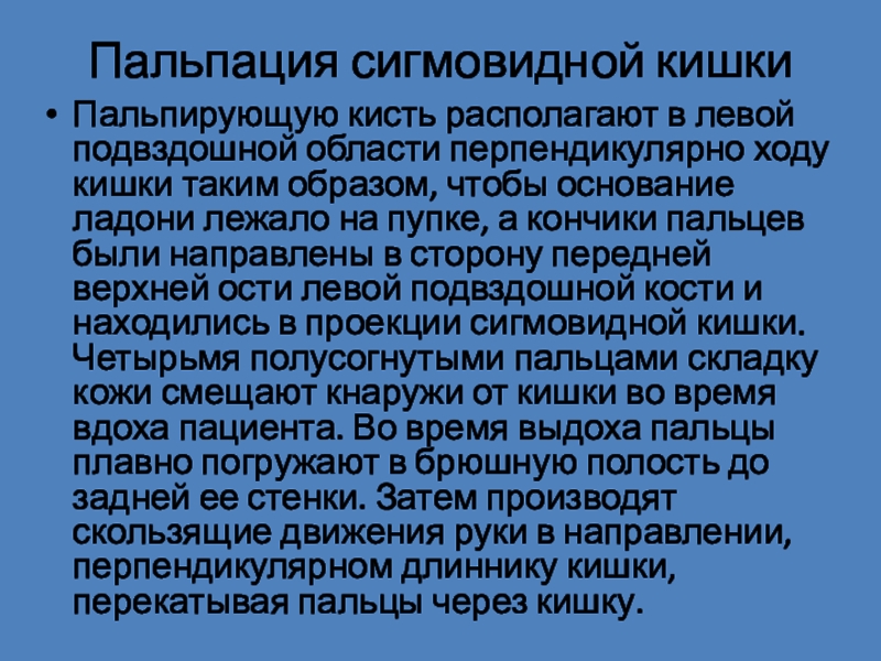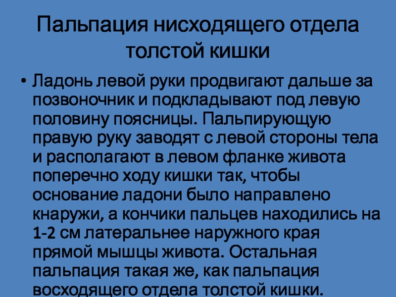 заводят с левой стороны тела и располагают в левом фланке живота поперечно ходу кишки так, чтобы основание ладони было направлено кнаружи, а кончики пальцев находились на 1-2 см латеральнее наружного края прямой мышцы живота. Остальная пальпация такая же, как пальпация восходящего отдела толстой кишки.