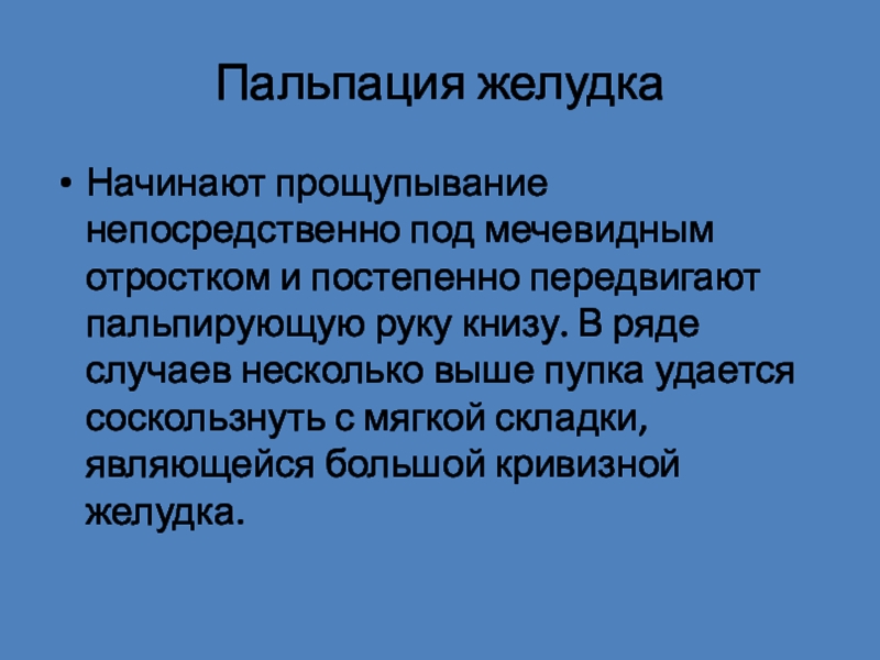 Начинают прощупывание непосредственно под мечевидным отростком и постепенно передвигают