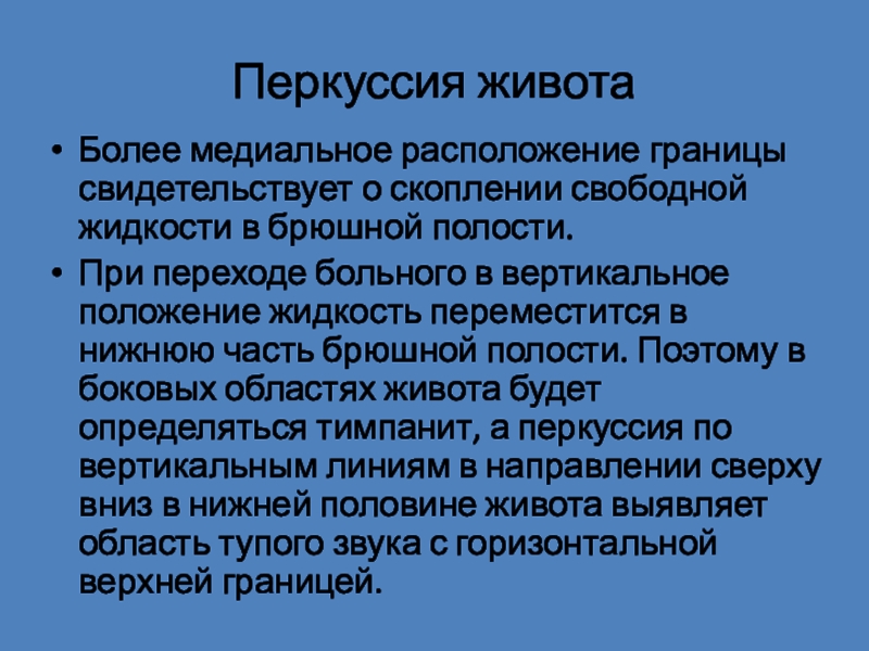 в нижнюю часть брюшной полости. Поэтому в боковых областях живота будет определяться тимпанит, а перкуссия по вертикальным линиям в направлении сверху вниз в нижней половине живота выявляет область тупого звука с горизонтальной верхней границей.