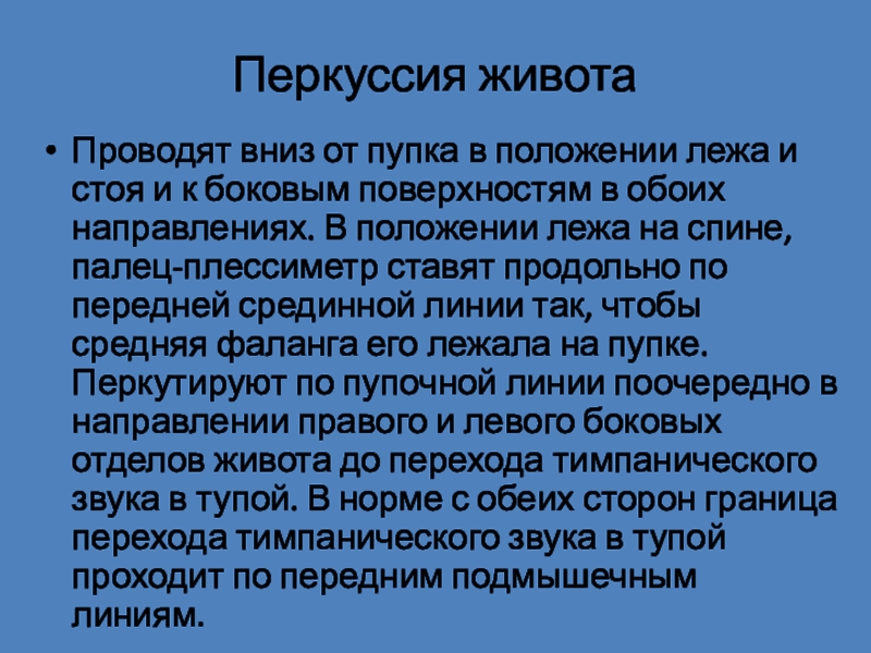 на спине, палец-плессиметр ставят продольно по передней срединной линии так, чтобы средняя фаланга его лежала на пупке. Перкутируют по пупочной линии поочередно в направлении правого и левого боковых отделов живота до перехода тимпанического звука в тупой. В норме с обеих сторон граница перехода тимпанического звука в тупой проходит по передним подмышечным линиям.
