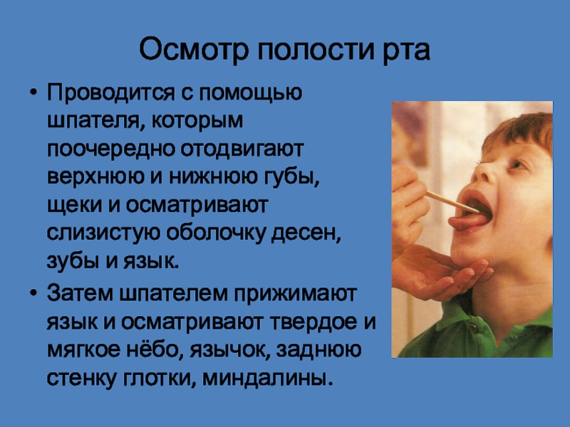 Затем шпателем прижимают язык и осматривают твердое и мягкое нёбо, язычок, заднюю стенку глотки, миндалины.