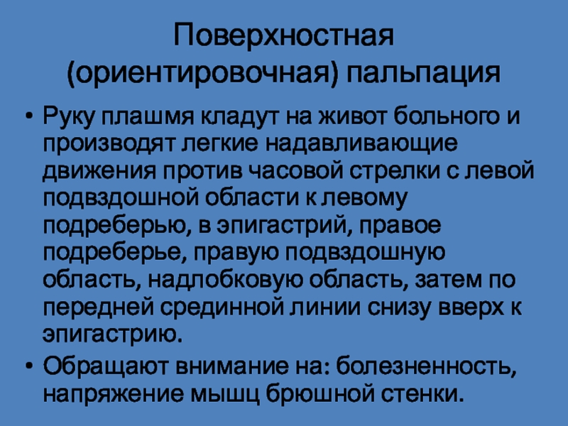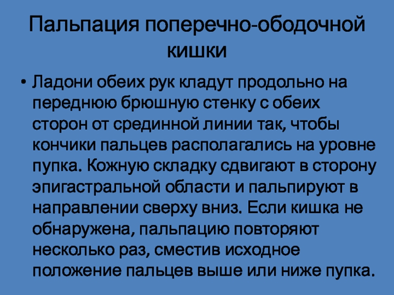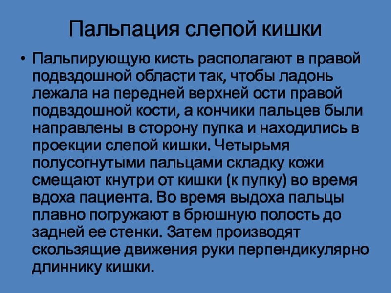 а кончики пальцев были направлены в сторону пупка и находились в проекции слепой кишки. Четырьмя полусогнутыми пальцами складку кожи смещают кнутри от кишки (к пупку) во время вдоха пациента. Во время выдоха пальцы плавно погружают в брюшную полость до задней ее стенки. Затем производят скользящие движения руки перпендикулярно длиннику кишки.