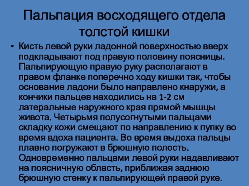 правом фланке поперечно ходу кишки так, чтобы основание ладони было направлено кнаружи, а кончики пальцев находились на 1-2 см латеральные наружного края прямой мышцы живота. Четырьмя полусогнутыми пальцами складку кожи смещают по направлению к пупку во время вдоха пациента. Во время выдоха пальцы плавно погружают в брюшную полость. Одновременно пальцами левой руки надавливают на поясничную область, приближая заднюю брюшную стенку к пальпирующей правой руке.