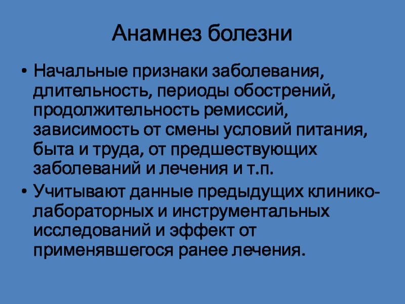 Учитывают данные предыдущих клинико-лабораторных и инструментальных исследований и эффект от применявшегося ранее лечения.