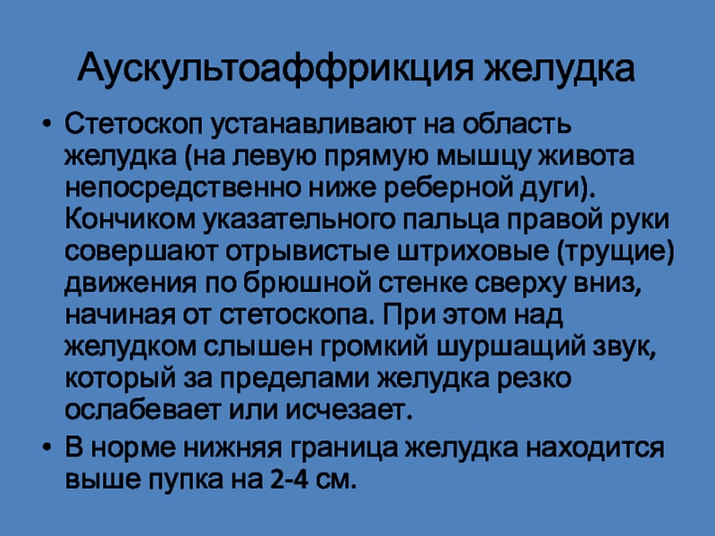 совершают отрывистые штриховые (трущие) движения по брюшной стенке сверху вниз, начиная от стетоскопа. При этом над желудком слышен громкий шуршащий звук, который за пределами желудка резко ослабевает или исчезает.
