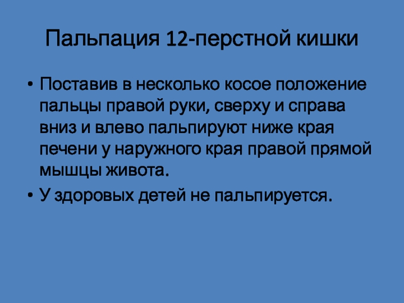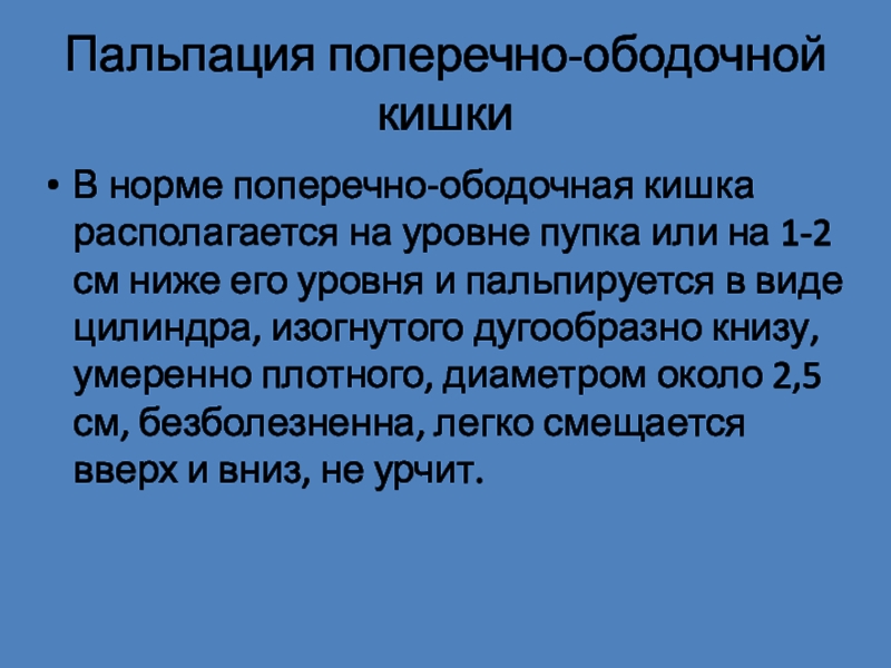 Слайд 27Пальпация восходящего отдела толстой кишки