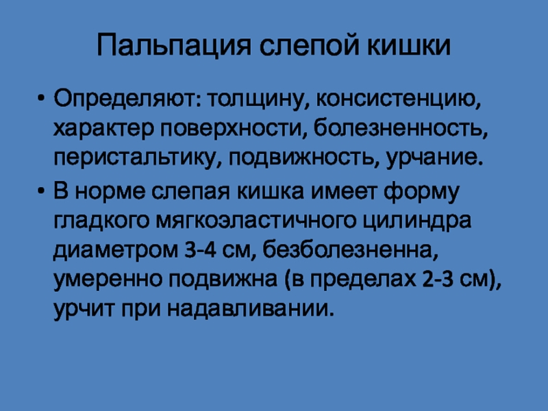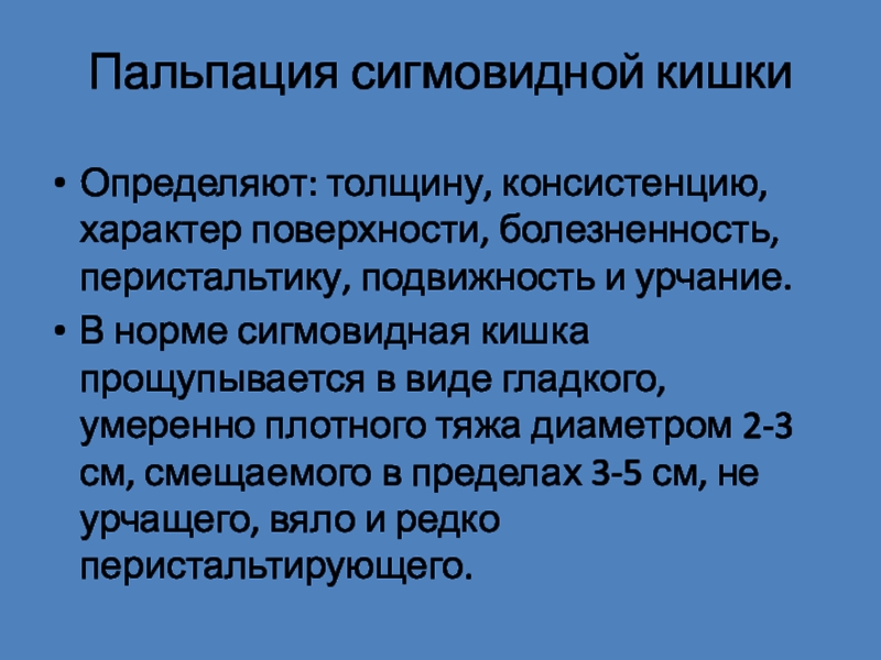 Определяют: толщину, консистенцию, характер поверхности, болезненность, перистальтику, подвижность,