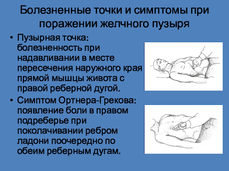 Симптом Ортнера-Грекова: появление боли в правом подреберье при поколачивании ребром ладони поочередно по обеим реберным дугам.