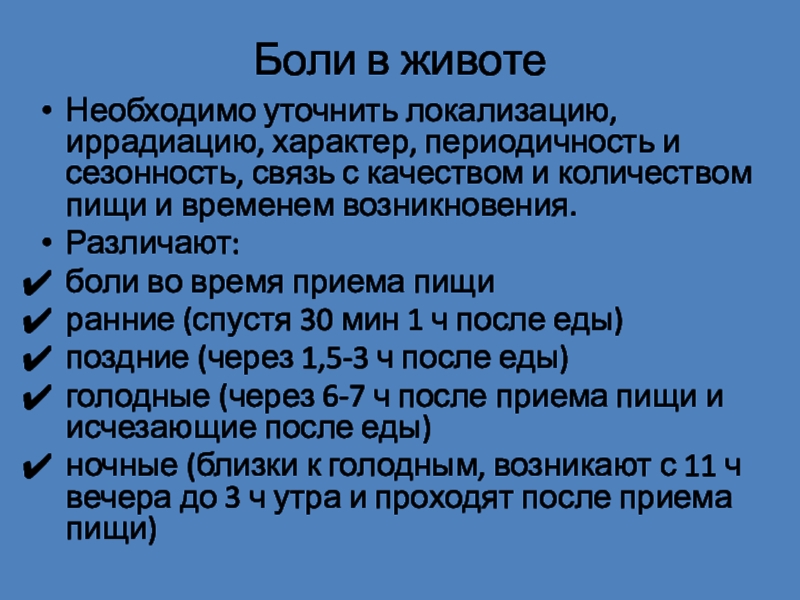 голодные (через 6-7 ч после приема пищи и исчезающие после еды)