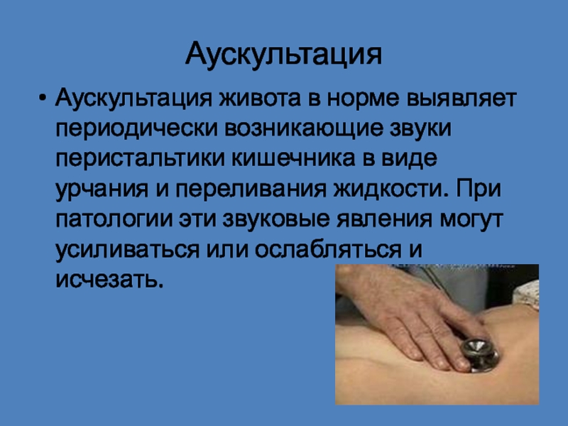 Аускультация живота в норме выявляет периодически возникающие звуки перистальтики кишечника