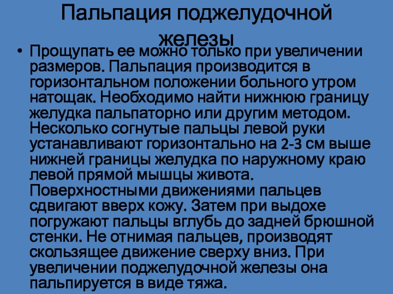 границу желудка пальпаторно или другим методом. Несколько согнутые пальцы левой руки устанавливают горизонтально на 2-3 см выше нижней границы желудка по наружному краю левой прямой мышцы живота. Поверхностными движениями пальцев сдвигают вверх кожу. Затем при выдохе погружают пальцы вглубь до задней брюшной стенки. Не отнимая пальцев, производят скользящее движение сверху вниз. При увеличении поджелудочной железы она пальпируется в виде тяжа.