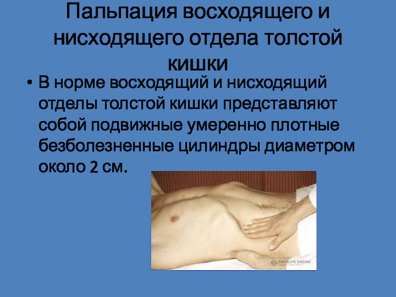Слайд 29Пальпация восходящего и нисходящего отдела толстой кишки