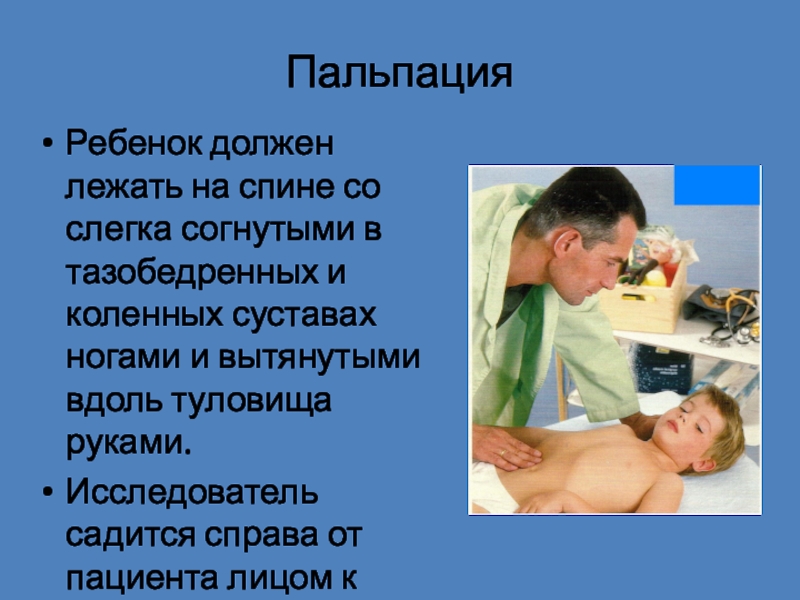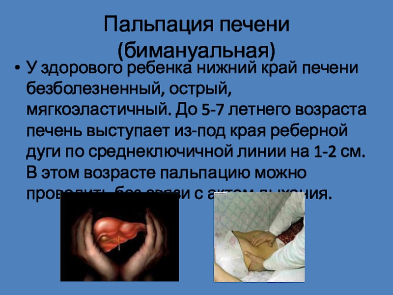клетки. Правую руку плашмя кладут на правую половину живота, при выдохе ребенка руку глубоко вводят в брюшную полость, при вдохе пальпирующая рука выводится из брюшной полости в направлении вперед и вверх, обходя край печени. В этот момент определяют форму и очертания края печени, консистенцию, болезненность.