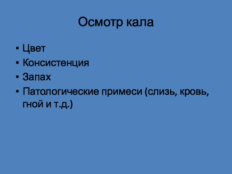 Выясняют объем рвотных масс, их запах, цвет, консистенцию, наличие остатков пищи и различных примесей.