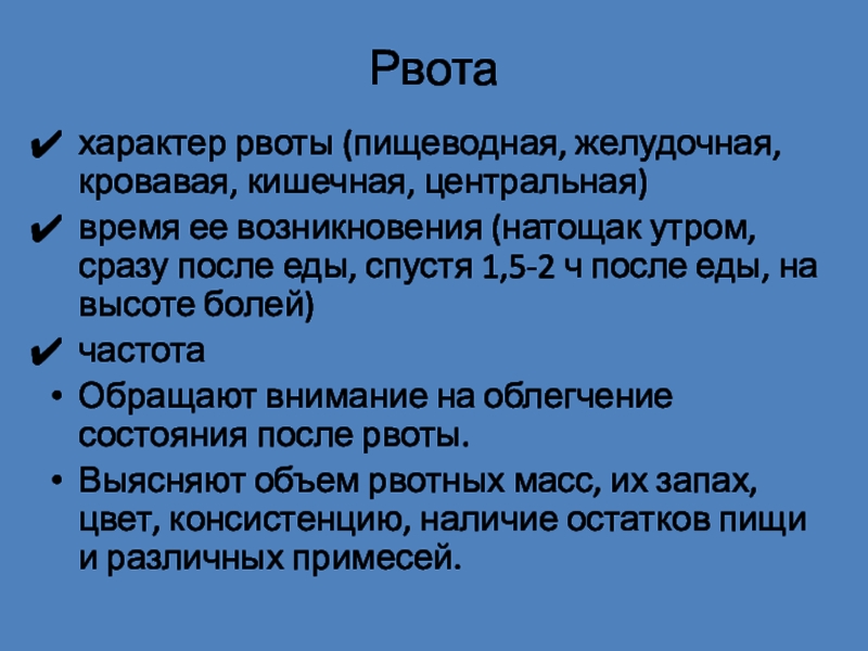 характер рвоты (пищеводная, желудочная, кровавая, кишечная, центральная)