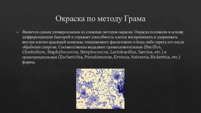 воспринимать и удерживать внутри клетки красящий комплекс генцианового фиолетового и йода либо терять его после обработки спиртом. Соответственно выделяют грамположительные (Bacillus, Clostridium, Staphylococcus, Streptococcus, Lactobacillus, Sarcina, etc.) и грамотрицательные (Escherichia, Pseudomonas, Erwinia, Neisseria, Rickettsia, etc.) формы.